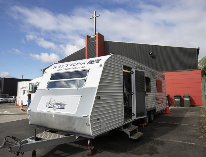 Retired dentist Sue Cole heads the Trinity Koha Dental Clinic, which runs under the umbrella of YWAM (Youth with a Mission) Ships Aotearoa. The clinic consists of a container, a caravan, and a group of volunteers who move between poorer communities offering free dental care. Sue has three volunteer dentists on deck today, working at pace out of a caravan in a Tauranga carpark.