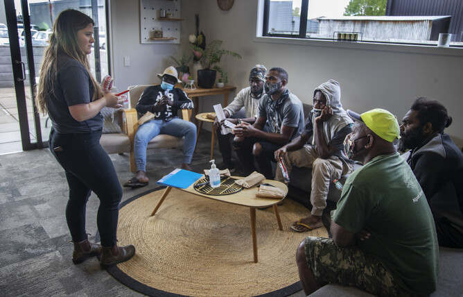 It’s in this carpark outside Lifezone that the dental clinic sets up for a week in the October school holidays. A steady stream of RSE workers from Vanuatu come through the clinic today, referred by their employers. A volunteer fluent in Bislama runs a quick workshop on oral hygiene while the men take turns in the dentist’s chair.